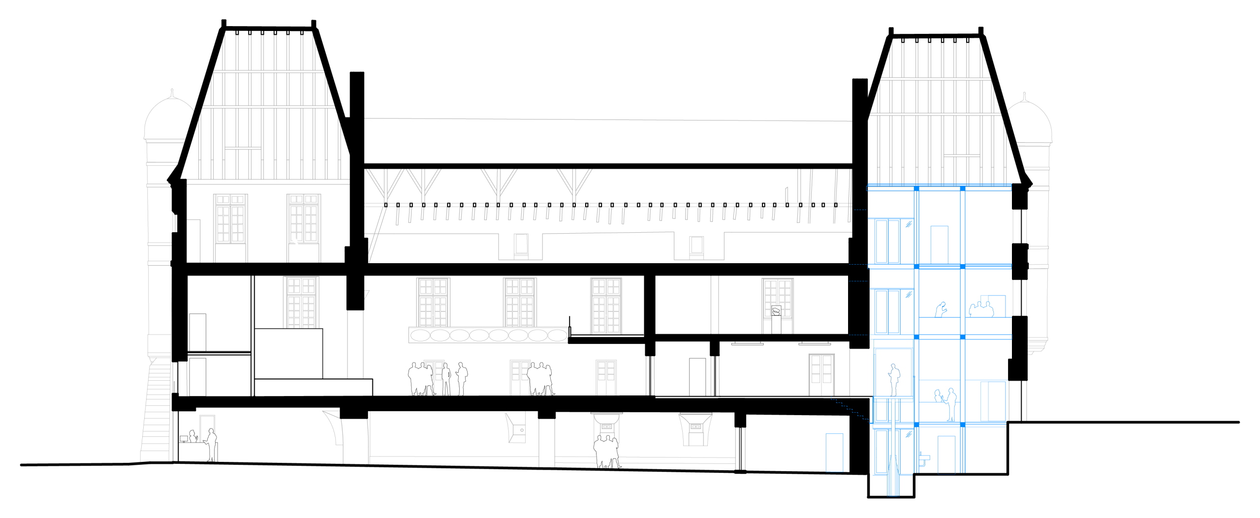 Nous proposons de rassembler l’ensemble des circulations verticales et des éléments techniques dans la tour Est, étant la plus délabrée. Cette stratégie permet de libérer complètement les étages du cœur du Palais et de la tour Ouest, et de rendre les espaces réversibles. L’ensemble est servi par une tour intérieure en bois massif autoportée, permettant d’alléger les charges sur les murs en pierre. Cette tour accueille les escaliers, l’ascenseur, les réseaux et fluides, les sanitaires et tous les éléments nécessaires au fonctionnement de chaque étage.