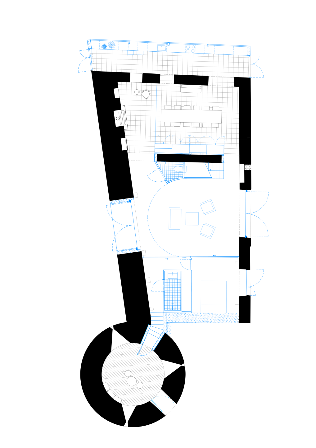 La maison se module et s’adapte suivant le nombre d’occupants et les saisons. Le bâtiment se divise en trois entités : la tour est pensée comme un lieu d’été, la maison existante comme une petite entité autosuffisante pour l’hiver, et l’espace central comme un espace flexible qui s’adapte aux usages.