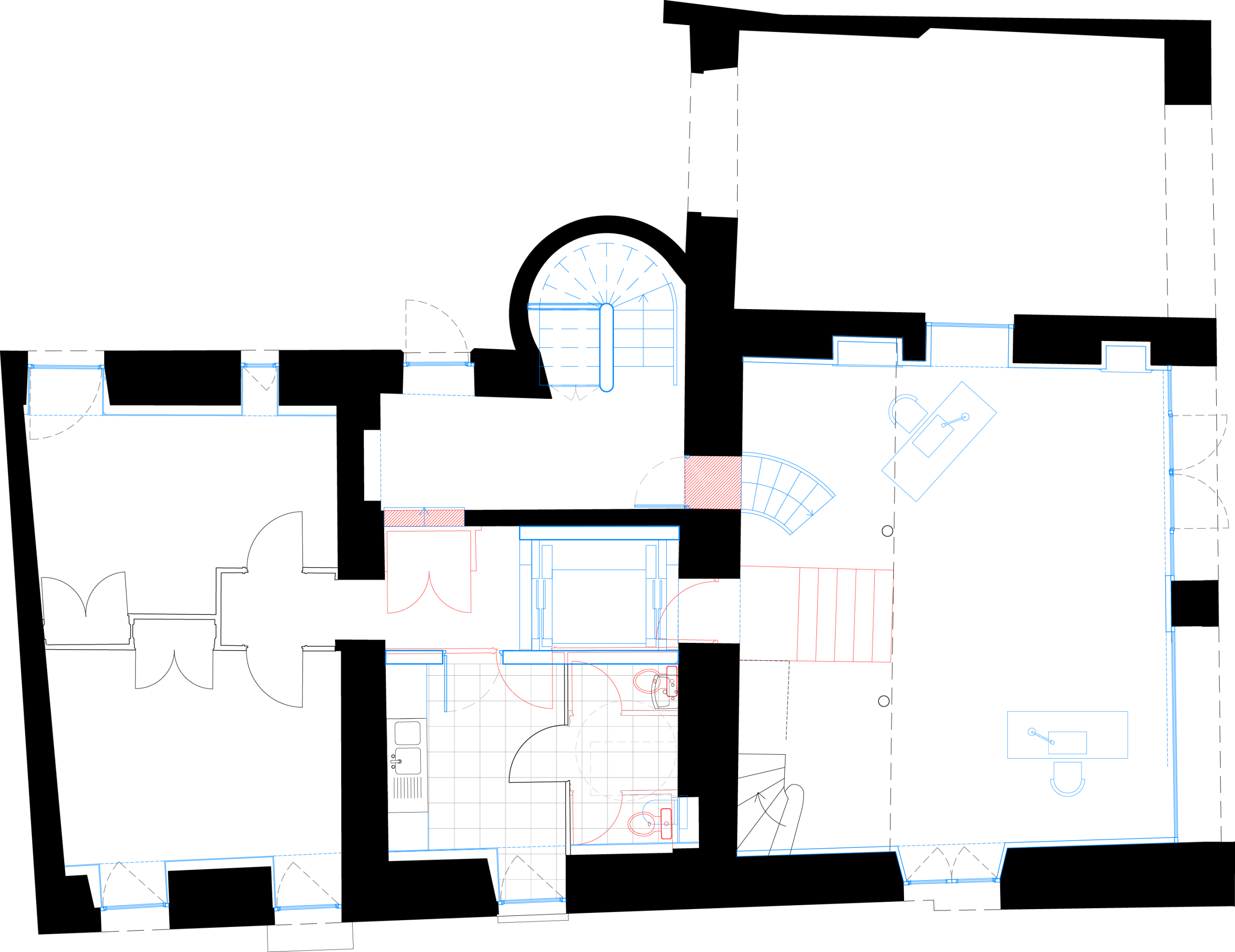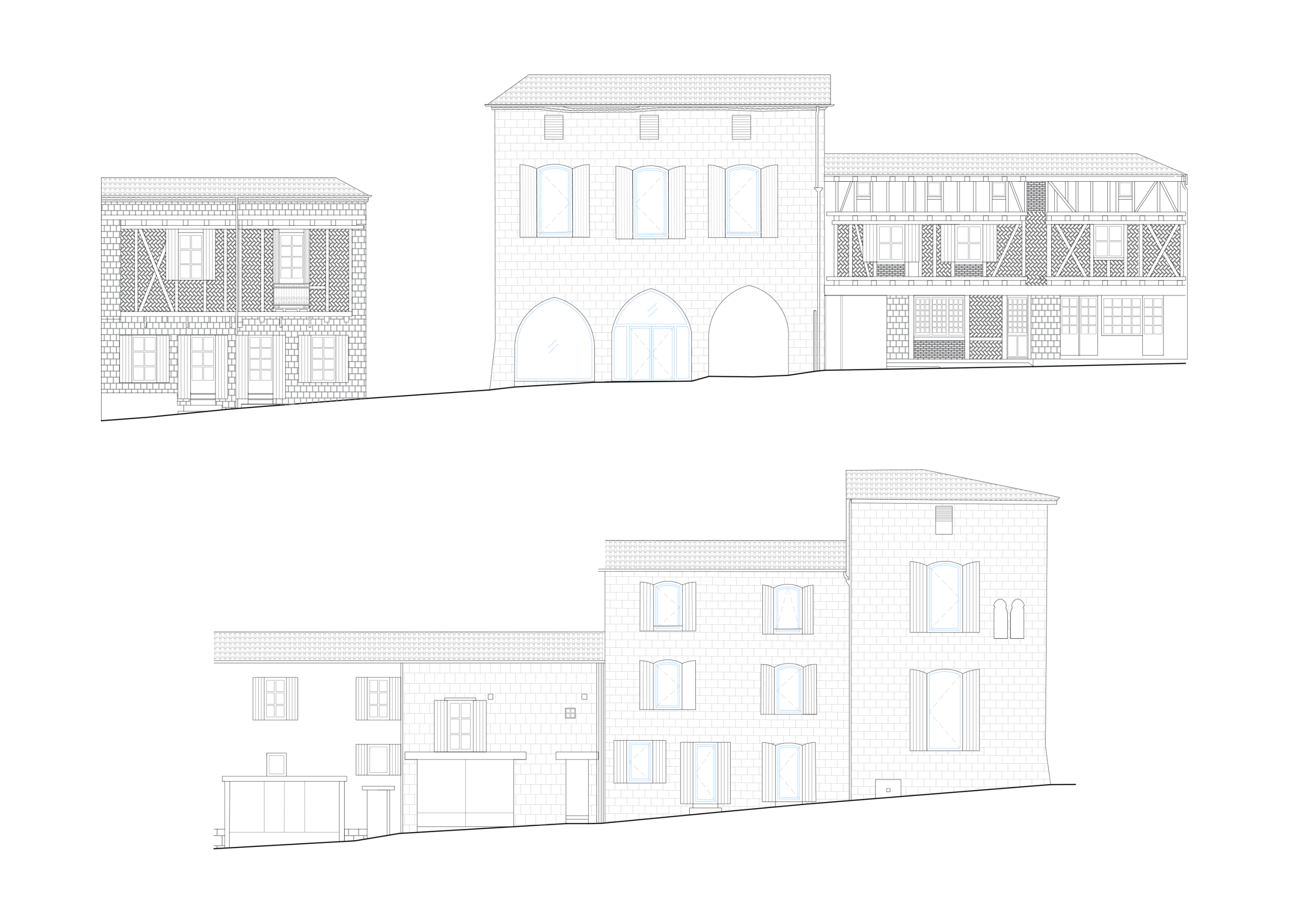 Dans le centre-bourg médiéval de Monflanquin, la commune a souhaité rendre accessible un bâtiment dédié au service public, avec différentes activités à chaque niveau. Dans ce contexte patrimonial, la réflexion a consisté à proposer de nouveaux aménagements discrets mais nécessaires à l’accueil du public, afin de l’orienter correctement à l’extérieur et dans le bâtiment. L’ascenseur desservant tous les niveaux a donc été implanté à l’intérieur du bâtiment, à un emplacement central pour l’ensemble des programmes. L’escalier existant sera déposé et refait pour s’adapter à l’ERP.